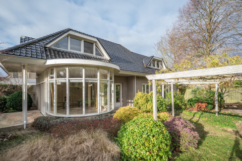 De villa betreedt u via de overdekte entree met een stijlvolle toog. U staat daarna in de ruime ontvangsthal voorzien van een Franse plavuizen vloer met vloerverwarming. Hier bevindt zich ook een separaat toilet en de trap naar de eerste verdieping. Binnen vormen de keuken en de uitgebouwde woonkamer samen één open leefruimte, waarbij de uitbouw met de dubbele tuindeuren aan de achterzijde meteen opvalt. Door de grote glazen pui met openslaande deuren naar de tuin is dit een fijne lichte plek met tuinzicht en ideaal geschikt als bijvoorbeeld TV, speel- of eetkamer. De open keuken beschikt over een Boretti gasfornuis, koelkast, vaatwasmachine, close-in boiler en een afzuigkap. Via de praktische aangrenzende bijkeuken met koffiemachine, vriezer en koelkast kom je in de grote aangebouwde garage. Mooi zijn de massieve, openslaande deuren. Deze garage heeft dubbele spouwmuren voor een optimale isolatie.